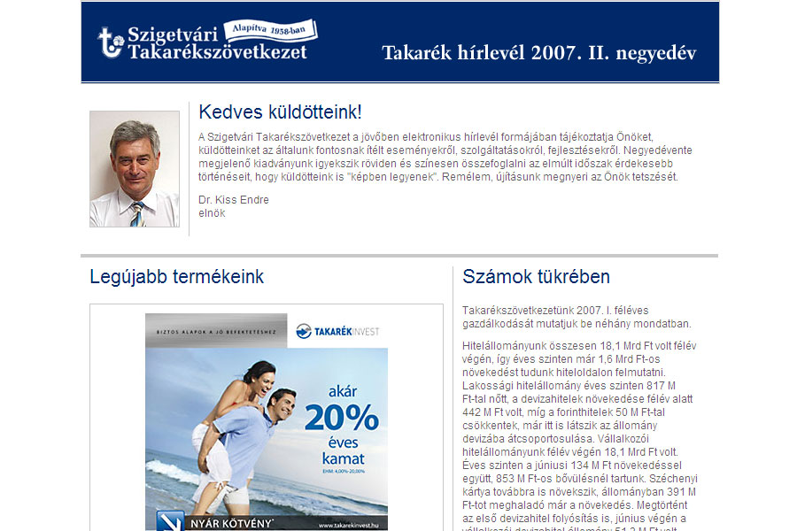 Ha nem is áll mindennapos kapcsolatban partnereivel, ügyfeleivel, egy hírlevél rendszeresen tájékoztathatja őket megújjuló termékeiről, szolgáltatásairól. A rendszeresen küldött hírlevél hatékony és gazdaságos mód a folyamatos információ-küldésre. A honlapba integrált hírlevél-küldő tájékoztathatja partnereit, így a visszatérő látogatók révén további megrendelőket szerezhet. Stúdiónk a honlapkészítés keretein belül hírlevél tervezés és hírlevél-küldő alkalmazások kialakításával biztosítja Ön számára a megfelelő figyelemfelkeltés lehetőségét.